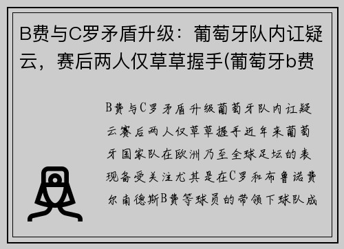 B费与C罗矛盾升级:葡萄牙队内讧疑云,赛后两人仅草草握手 近年来,葡萄牙国家队在欧洲乃至全球足坛的表现备受关注,尤其是在C罗和布鲁诺·费尔南德斯(B费)等球员的带领下,球队成绩稳步提升。然而,随着两位球星在场内外的互动愈发引发媒体关注,葡萄牙队似乎正面临着内讧的潜在威胁,尤其是在最近的比赛中,B费与...