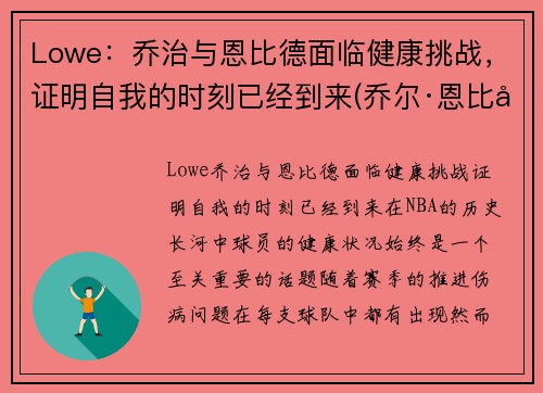 Lowe:乔治与恩比德面临健康挑战,证明自我的时刻已经到来 在NBA的历史长河中,球员的健康状况始终是一个至关重要的话题。随着赛季的推进,伤病问题在每支球队中都有出现,然而,只有少数球员能够在健康的挑战面前挺身而出,展现他们的真正价值。近期,NBA资深记者比尔·洛威(Bill Lowe)在分析乔治·...