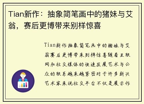 《Tian新作:抽象简笔画中的猪妹与艾翁,赛后更博带来别样惊喜》 随着互联网和社交媒体的快速发展,艺术与公众的联系越来越紧密。对于许多新兴艺术家来说,社交平台不仅是展示作品的地方,也是与粉丝互动、获得反馈的一个重要渠道。近年来,国内外许多艺术家的创作呈现出多元化、个性化的趋势,他们通过不同的艺术形式...